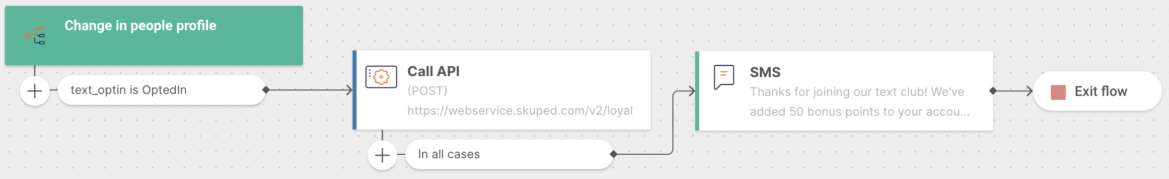 "balance_quantity" : 50with the point value you want to add to member’s accounts for entering the Flow.CODE{ "event_type": "add", "customers": [ { "phone": "+{msisdn}", "category": "Campaign", "source": "Infobp Flow", "details": "Infobip flow", "balance_quantity": 50 } ] }