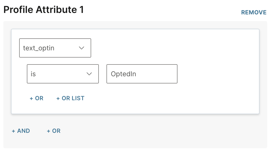 Enter in Profile Attribute 1 exactly as text_optin | is | OptedIn.