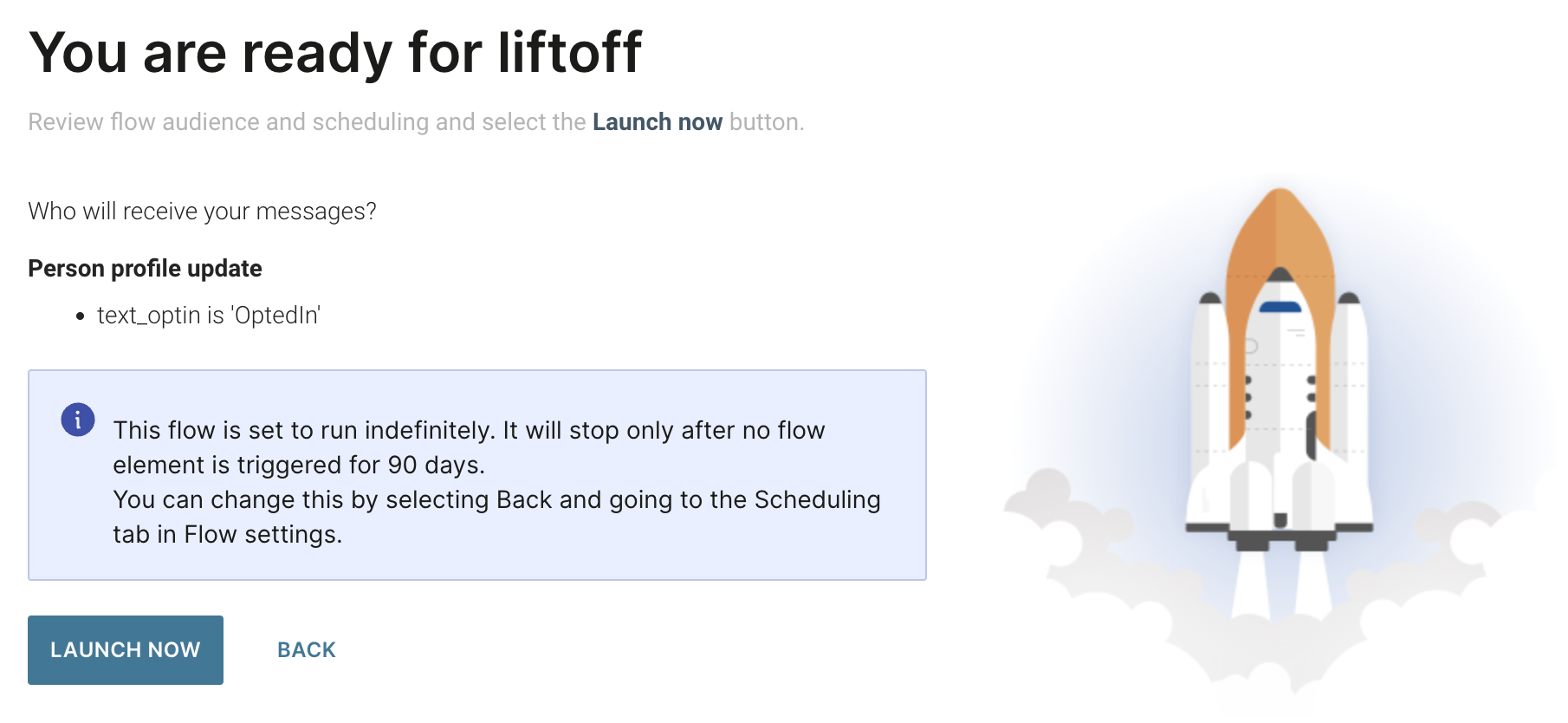 If you do not set your flow to run indefinitely, you can also set a start or date time. If no schedule is set, it will default end 90 days after its been launched.