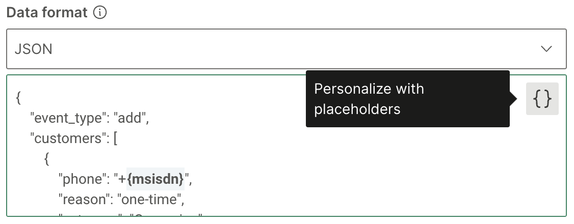 In the JSON code, highlight {msisdn} and click {} in the right corner to personalize with placeholders. Please note, the “+” prefix is required, do not remove.
