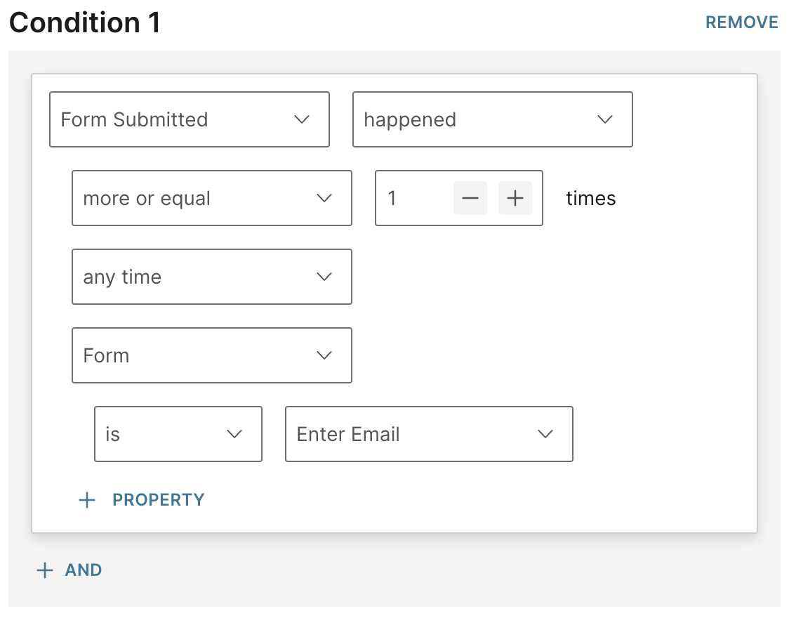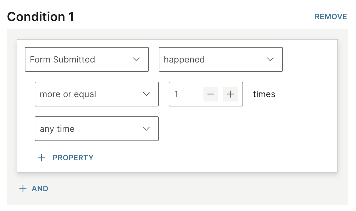 Define your People Real-Time Event Condition 1 to filter for when Form Submitted | happened | more or equal to | 1 times | any time