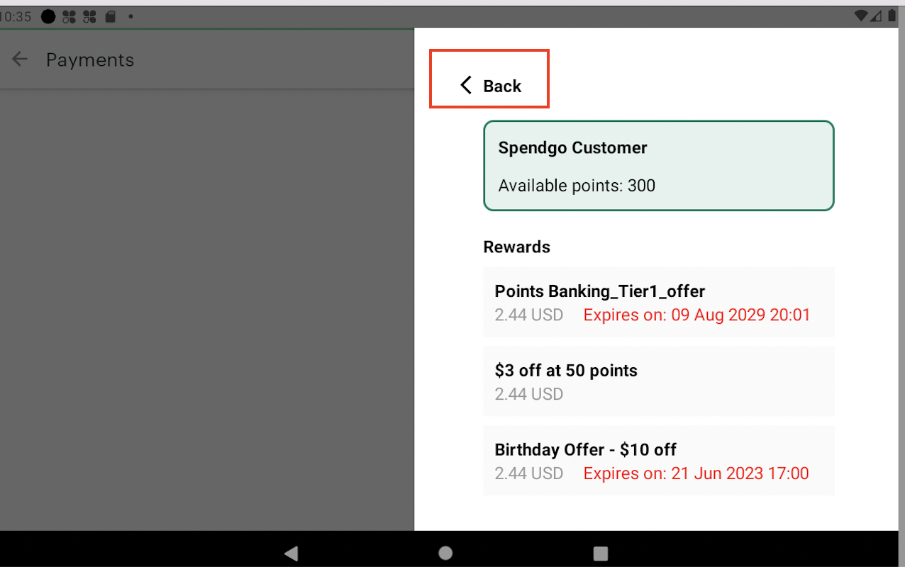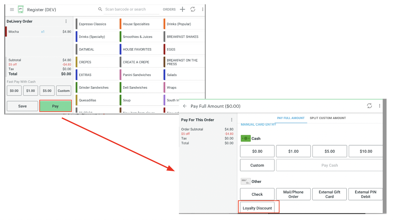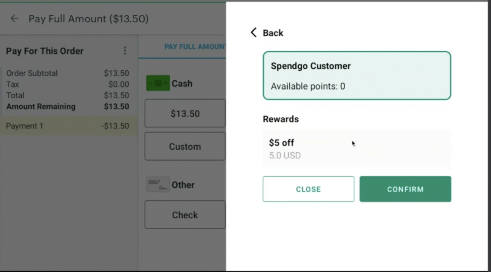 The Spendgo loyalty integration is enabled, a “Loyalty Reward” button shows up on the payment screen in the Register App.
