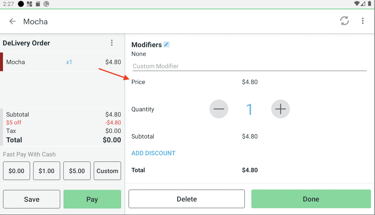 Click on the “Back” arrow to go back to go back and edit the check. New Item can be added or deleted , quantity modified or modifier changed.