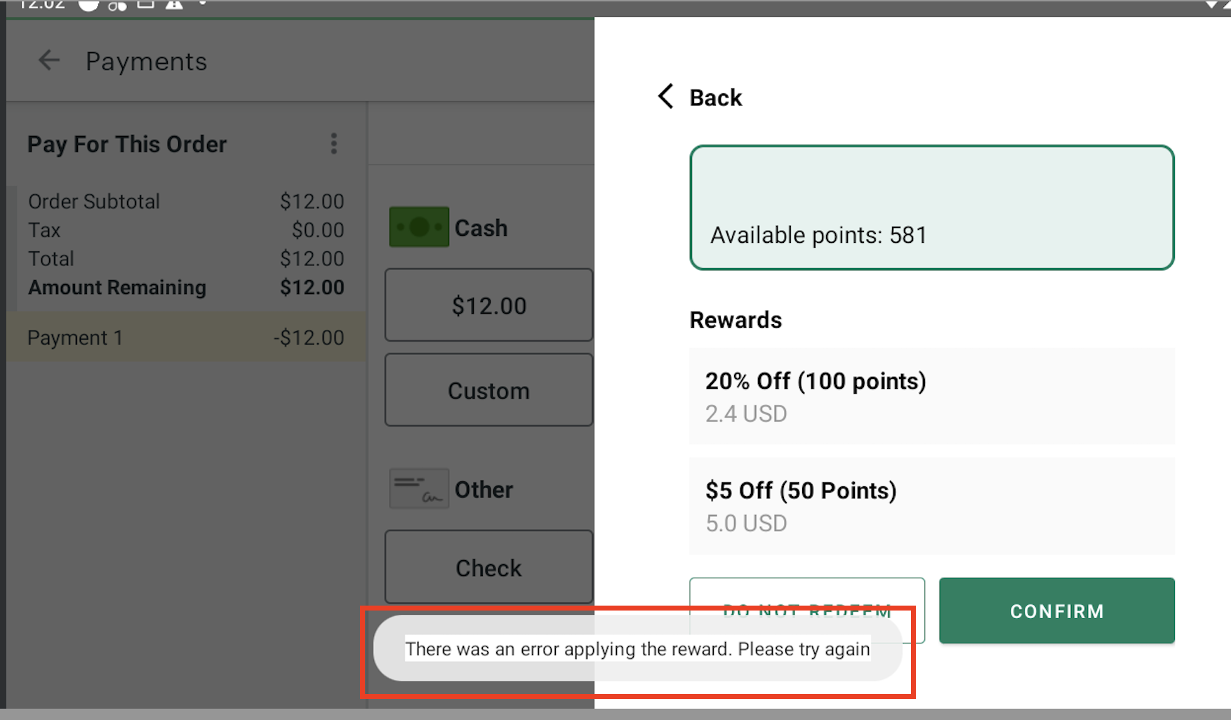 Please note that, only the rewards applicable to the order is listed after the lookup. However, the rewards is revalidated again when applied. Though it is highly unlikely if for whatever reason the reward fails to apply an error is displayed.