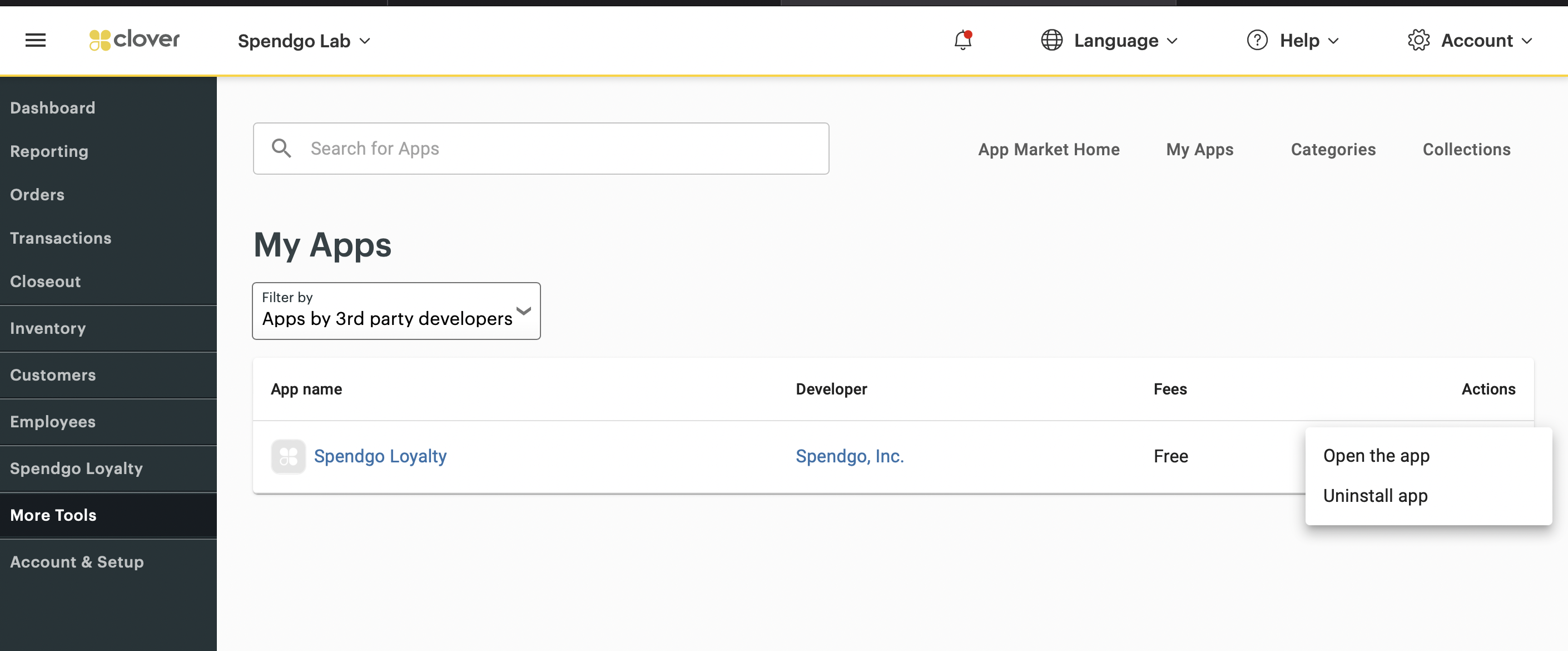 Then select the Uninstall app from the “Actions” menu next to “Spendgo Loyalty” App.
