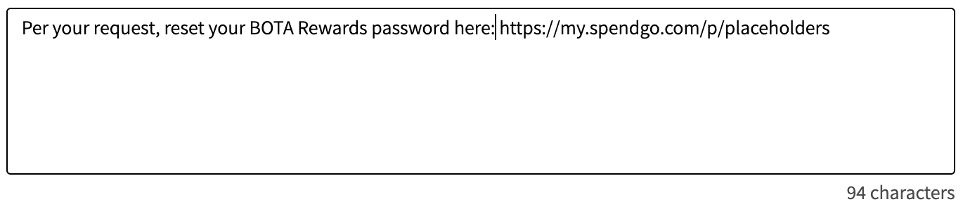Note: The unique reset password link is automatically appended to the end of each member’s message on send. You do not need to enter a placeholder value, the UI will automatically show the placeholder in your message content as "https://my.spendgo.com/p/placeholder".