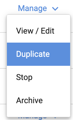 On the far right of the campaign row you wish to manage, click Manage / Duplicate.