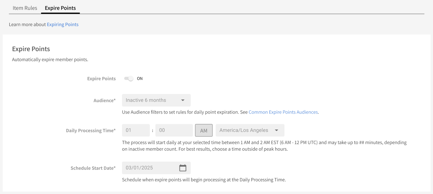 Once enabled, Expire Points runs daily at a set time (we recommend scheduling this during non-peak hours). Members who meet the audience criteria will have all of their points expire—partial expirations do not occur.