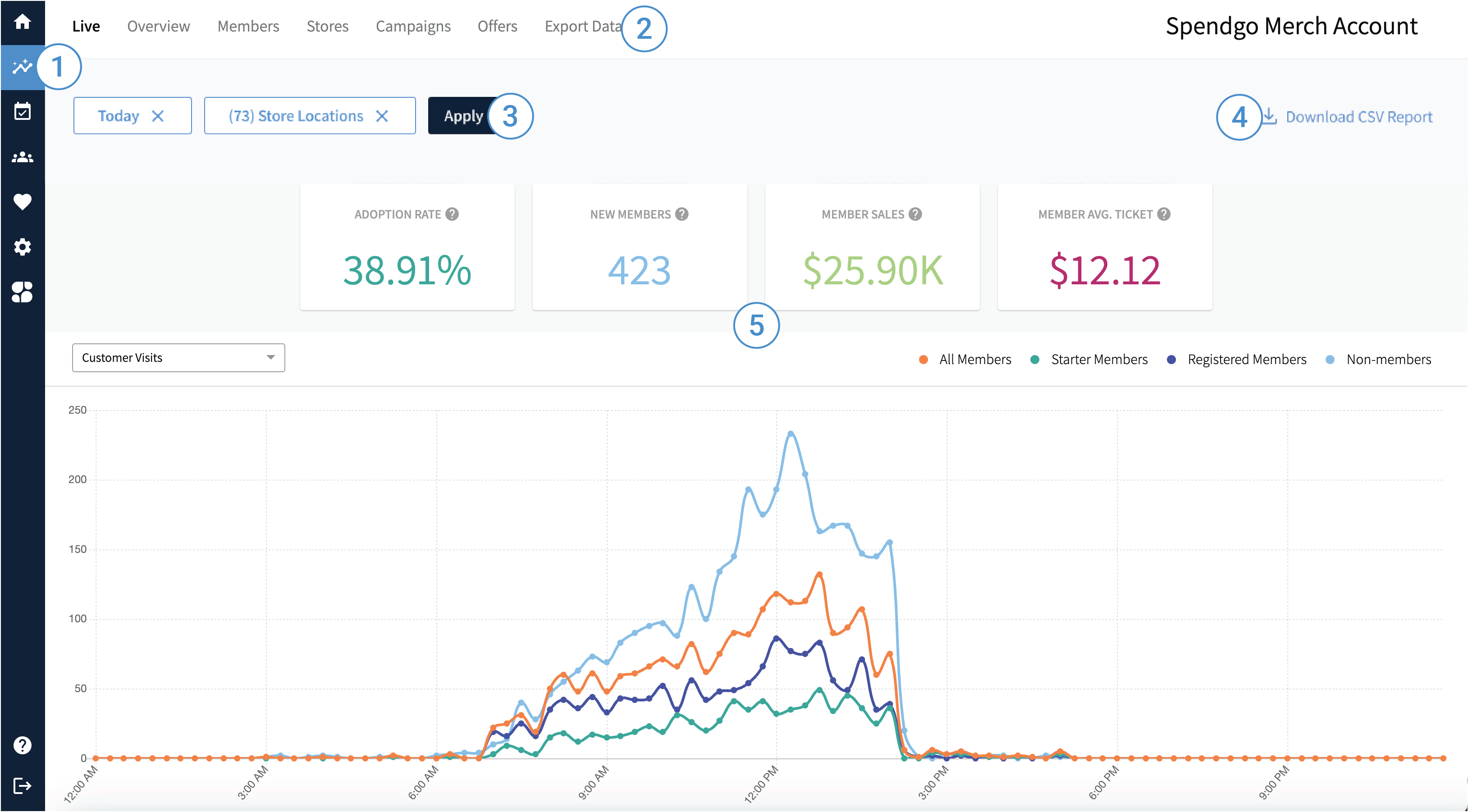 In each Insights section, you are able to use the filters to further refine your results. Filter options are specfic to the page. Learn more about the available filters in the specific Insights sections: Live, Overview, Members, Stores, Campaigns, and Rewards/Offers.