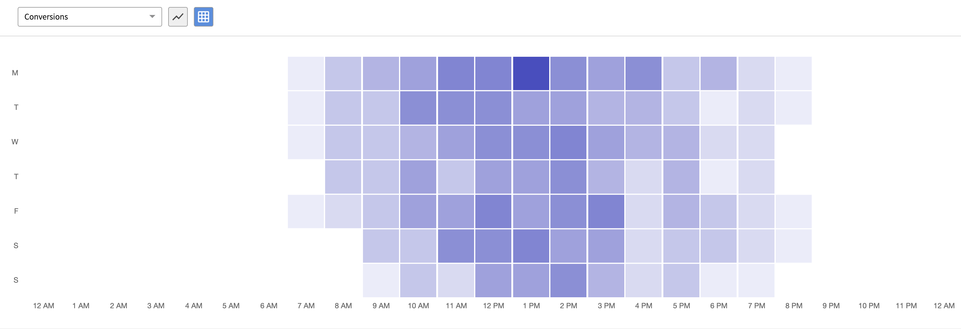 Time-of-Day Heat Chart — A heat chart that displays the data based on the day of the week and time of day, with varying colors indicating different levels of activity.