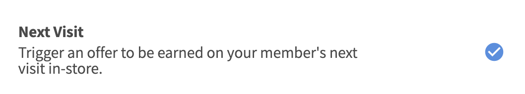 A Next Visit campaign makes an offer available to the Member upon their next in-store visit. Next Visit offers are perfect for Surprise and Delight campaigns, rewarding loyal members, and incentivizing members to drop into your store(s).