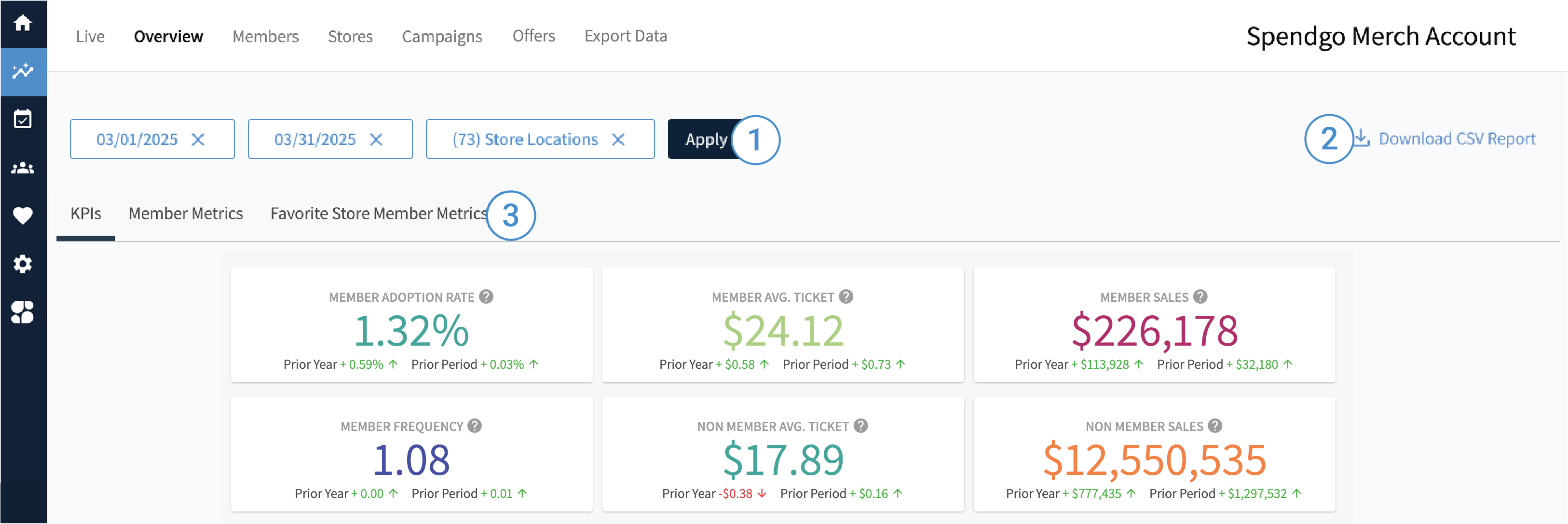 Tip: For more accurate comparisons, use a completed date range. Comparing an in-progress period (like the current month) to a full prior period may result in misleading conclusions—especially for KPIs like Member Sales.