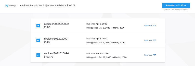 The following instructions are for paying your open invoices. Invoices can be accessed from your Spendgo billing email notifications sent to your billing contact’s email address.