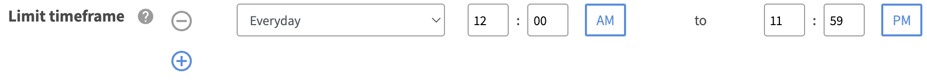 Note the default is set to everday and all day. To limit the timeframe, modify and add the day(s) and its time range.