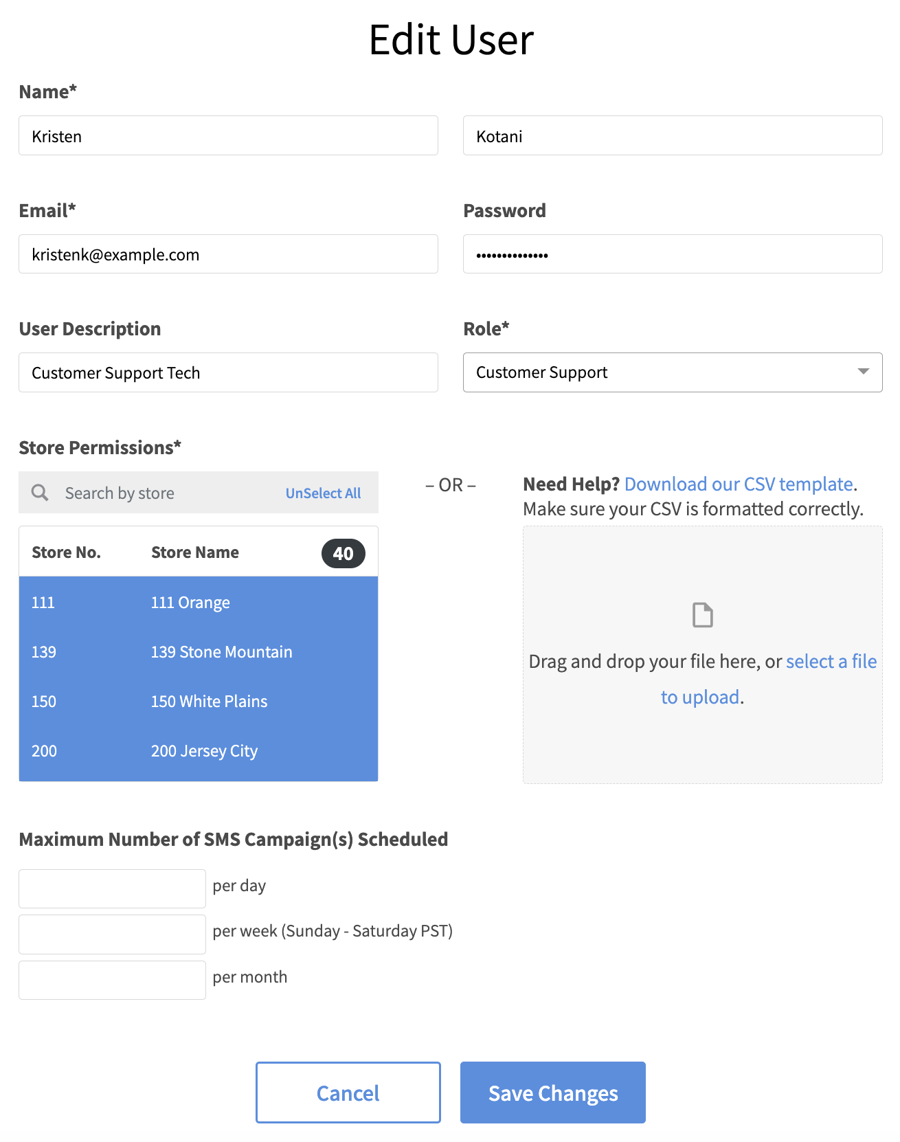 Enter the new User’s details to transfer (ex. a store has transferred ownership and you want the campaign history retained) or create a new secure password and rename the user to “Archive-{#####}” to block an existing User’s access.