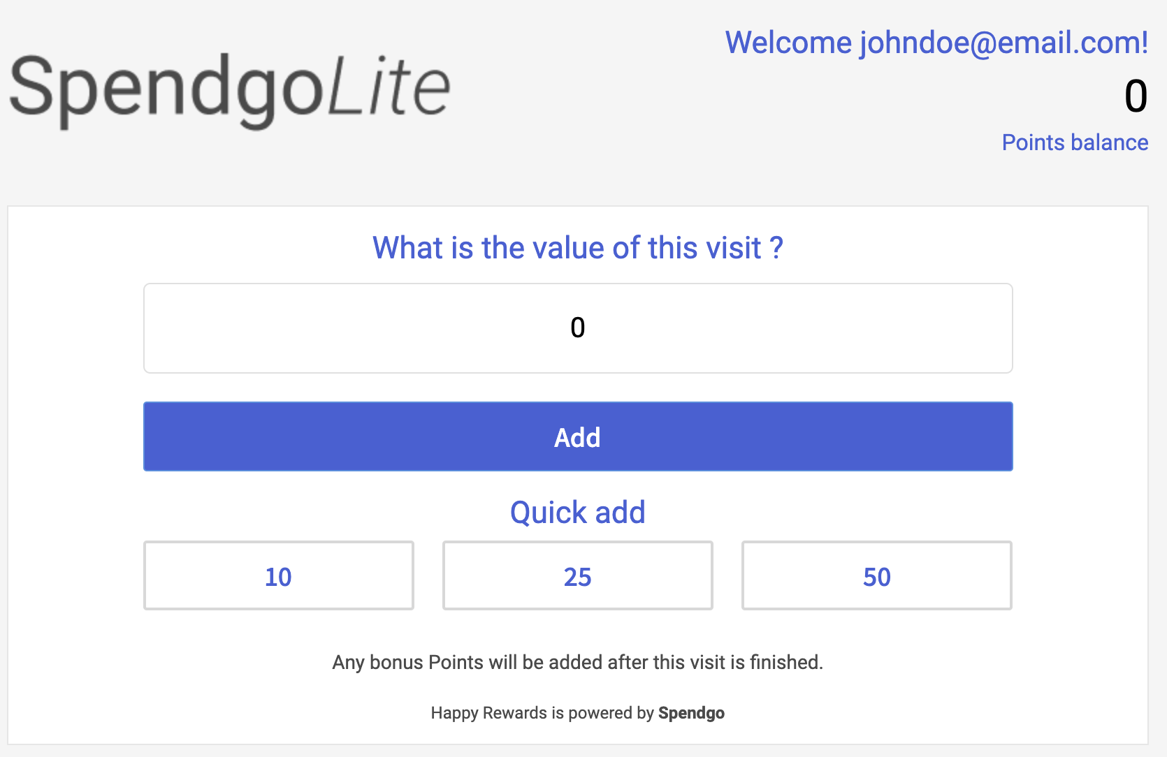 When using Spendgo Lite for browsers, we recommend that this is operated by your staff to prevent customers from abusing the system. If you are going to allow customers to use Spendgo Lite, please contact your Customer Success Team for additional options on how to limit the number of times a customer can earn points within a timeperiod.
