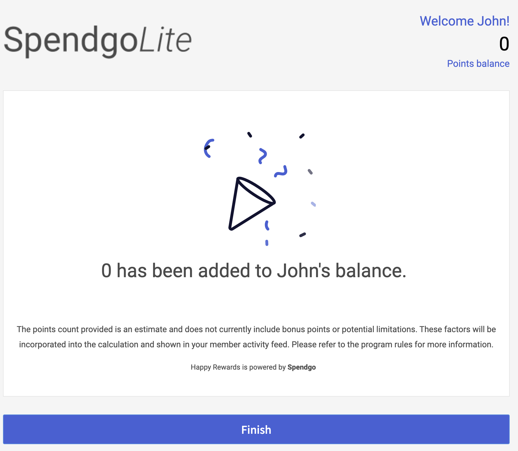 A summary screen will display with the points earned and the reward used on the visit. Click Finish to return to enter a new customer or member phone.