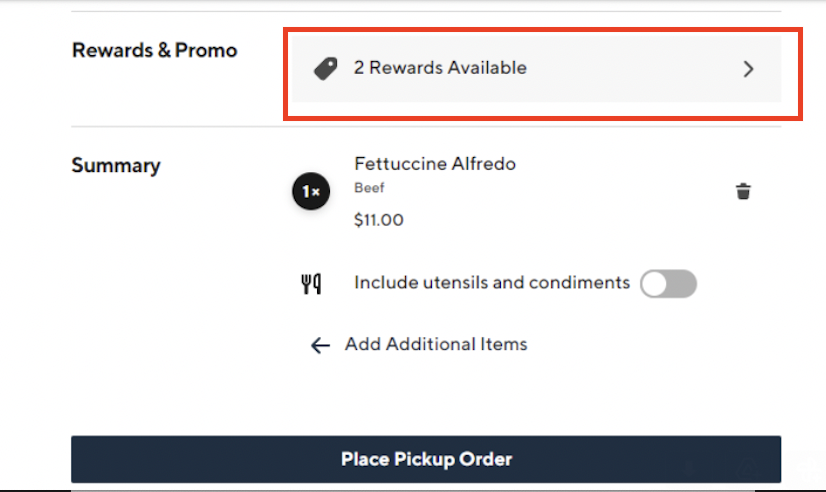 When the reward is applied, the updated order is shown with the reward applied.