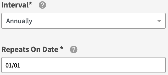 Set the annual Repeats On Date to January 1st (01/01) of every year, and click Next Step.