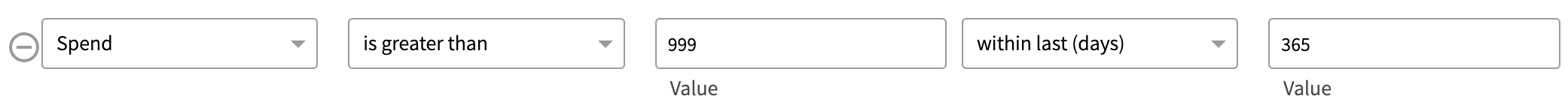 Enter the condition Spend | is greater than | ### | within last (days) | 365.